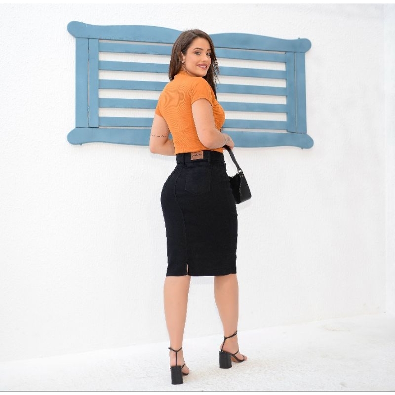 Saia Jeans Mídi Preta Com Elastano Secretaria