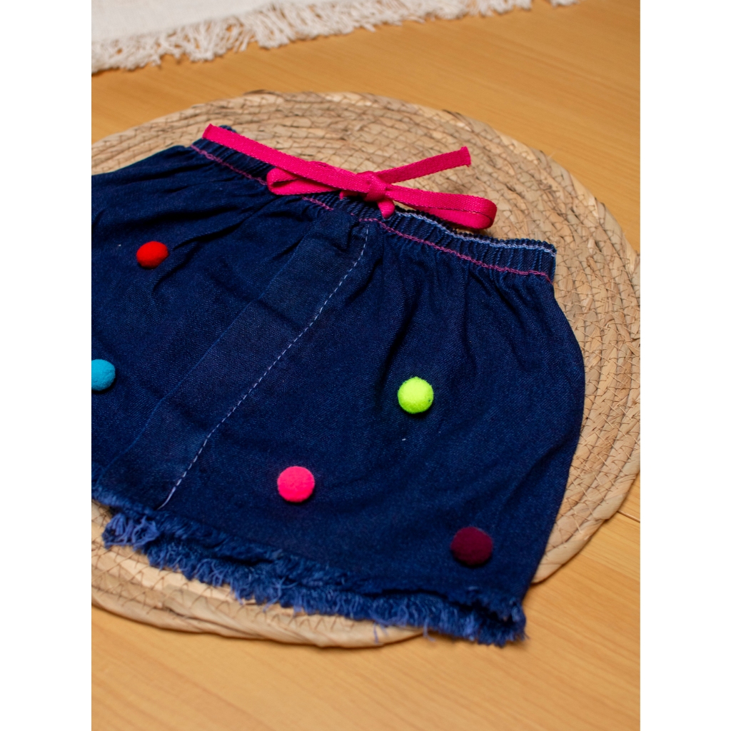 Saia Jeans Moda Infantil Menina Pompons Princesa Criança Elastico Cintura Bolinha Colorida Cor