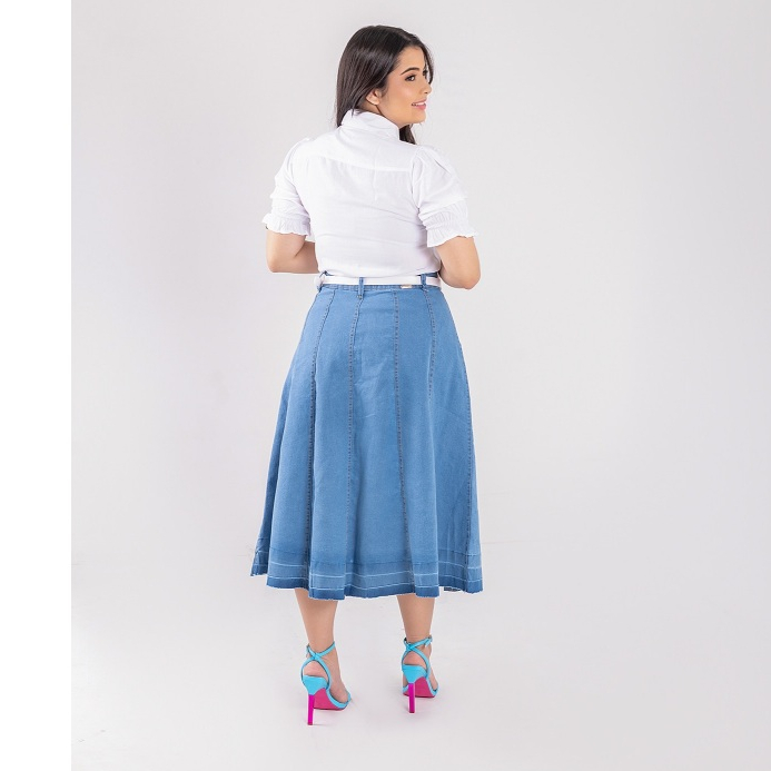 | Saia Jeans Rodada Azul Claro Evasê + Cinto Branco De Brinde (Ref. 1... este produto | R$ 79,90 | — | 4.9/5 | 115 |