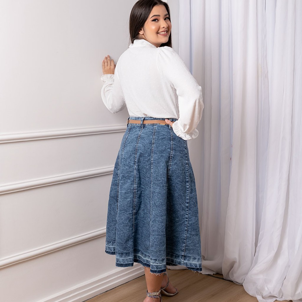 Saia Jeans Rodada Marmorizada Midi com Cinto de Couro Moda Feminina Evangélica Cristã Ref. 1218