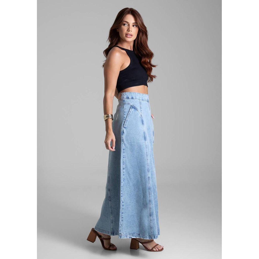 Saia feminina confeccionada em jeans. O design midi proporciona um toque que valoriza a silhueta, aliado a cintura super altal. Fechamento por zíper Bolsos frontais funcionais Tecido: Jeans Tipo de lavagem: azul Cor: Azul claro Composição: 100% ALGODÃO