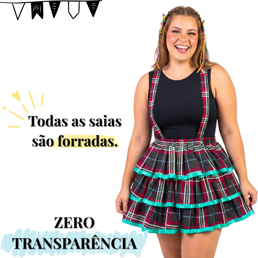 Saia Junina Plus Size com Suspensório Xadrez G1 G2 G3 – Forrada São João Festa Junina Salopete