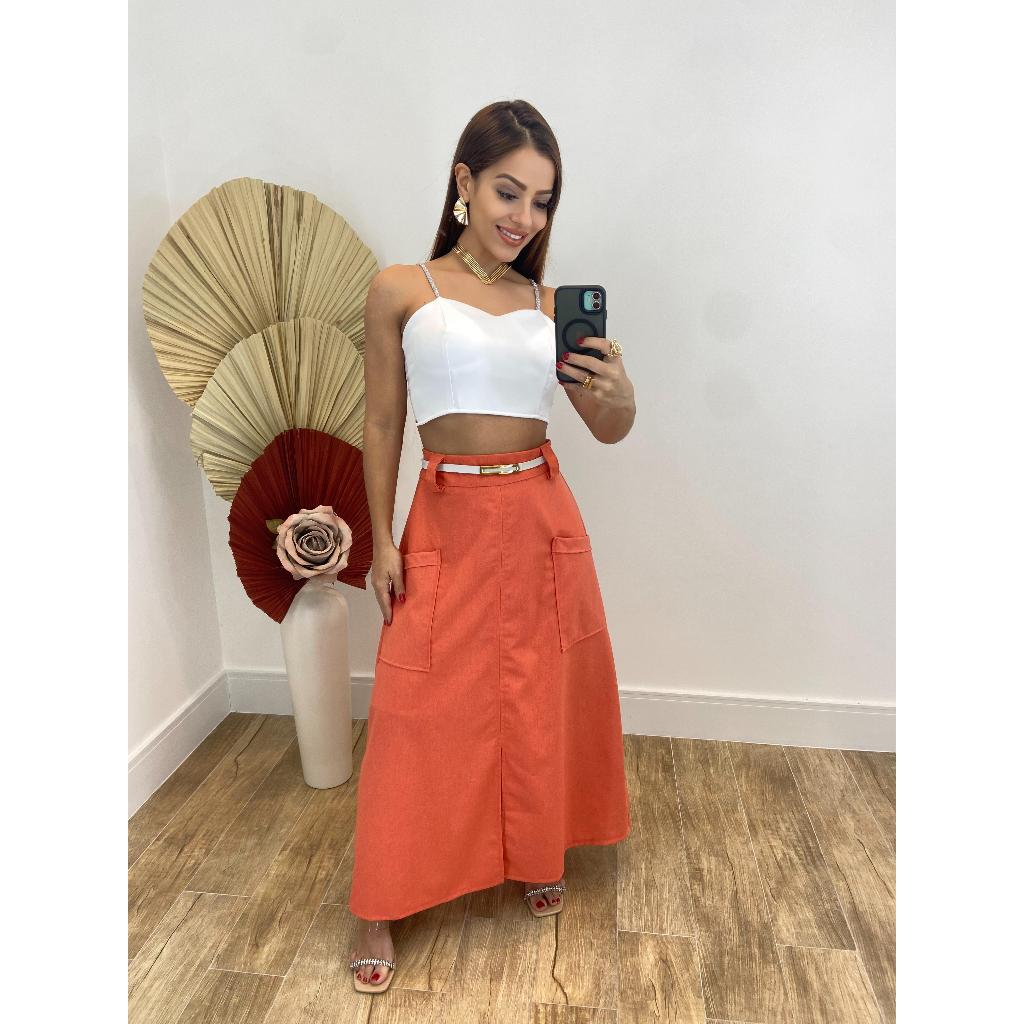 Saia Longa Cintura Alta Linho Forrada Com Bolsos Moda Atual Oferta Hoje