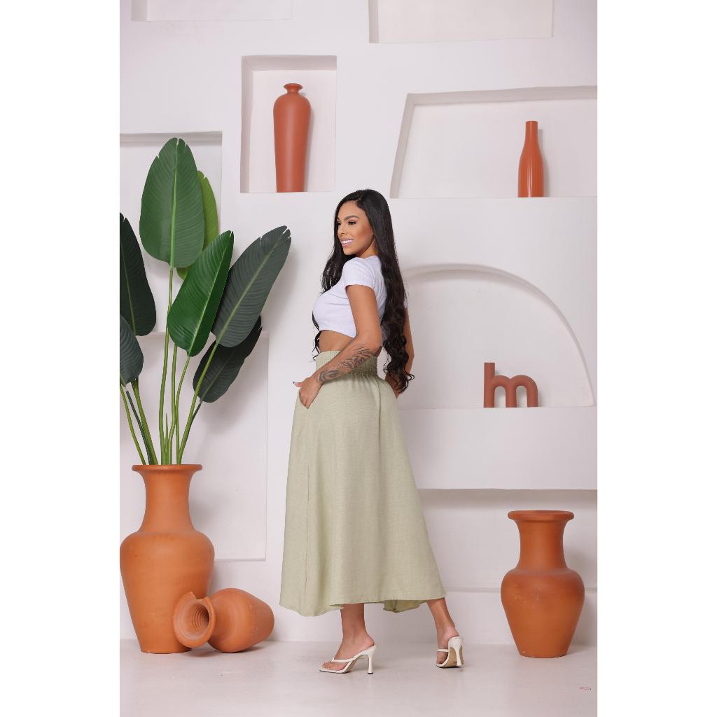 Saia Longa duna linho Com Bolsos e cintura com Elástico Moda Casual