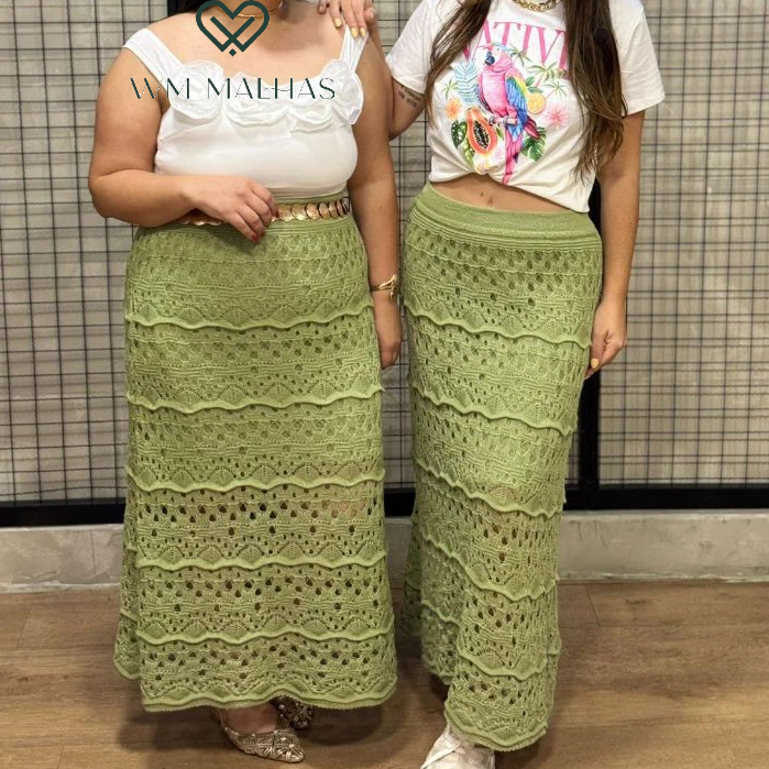 Saia Longa Feminina Tricot Ponto Crochê Confortavél Estilosa Tendência WM Malhas Moda Plus Size