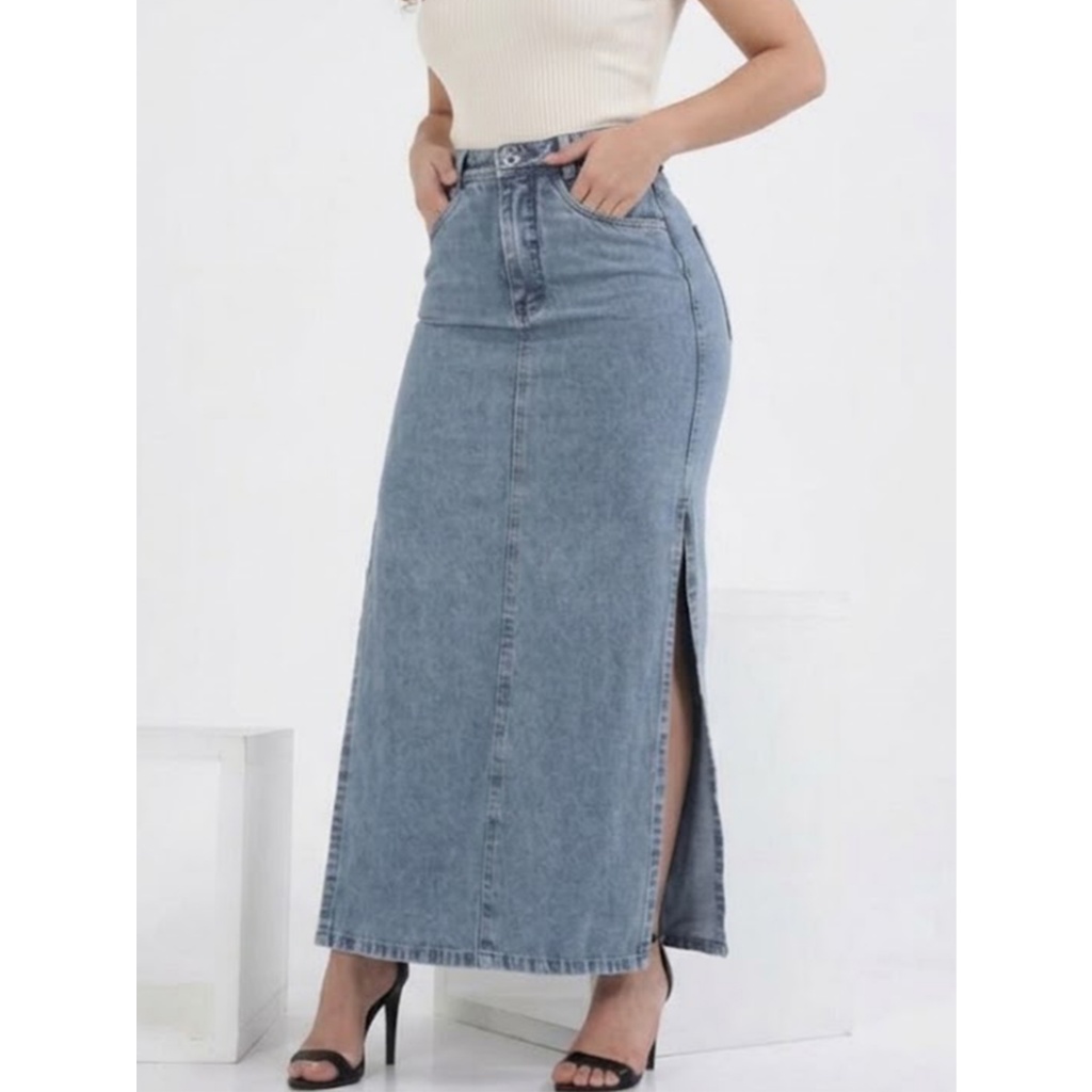 Saia Longa Jeans Abertura Lateral Cintura Alta