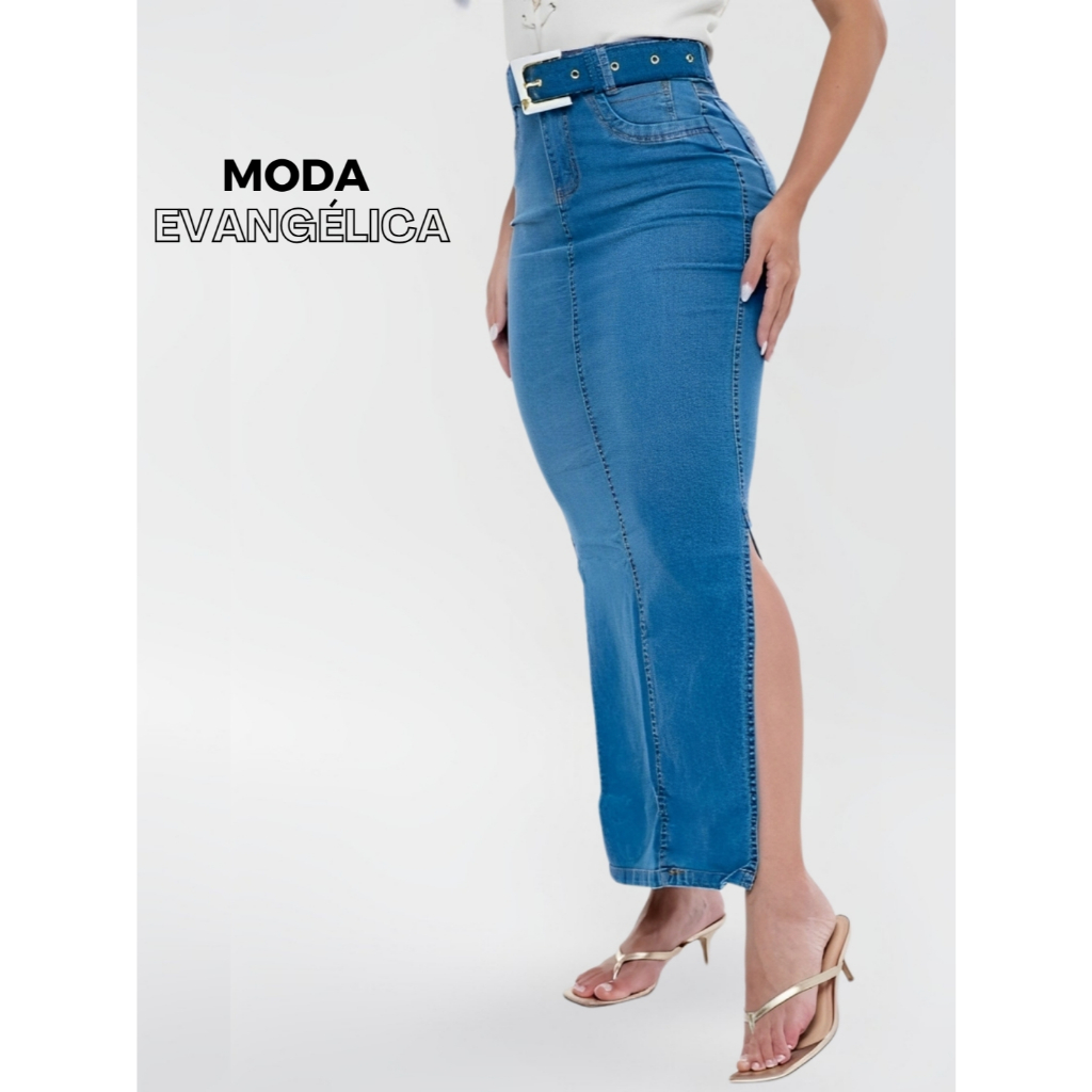 Saia Longa Jeans Cintura Alta com Fenda nas Duas Laterais Moderna Com Cinto Moda Evangélica 7Pallas