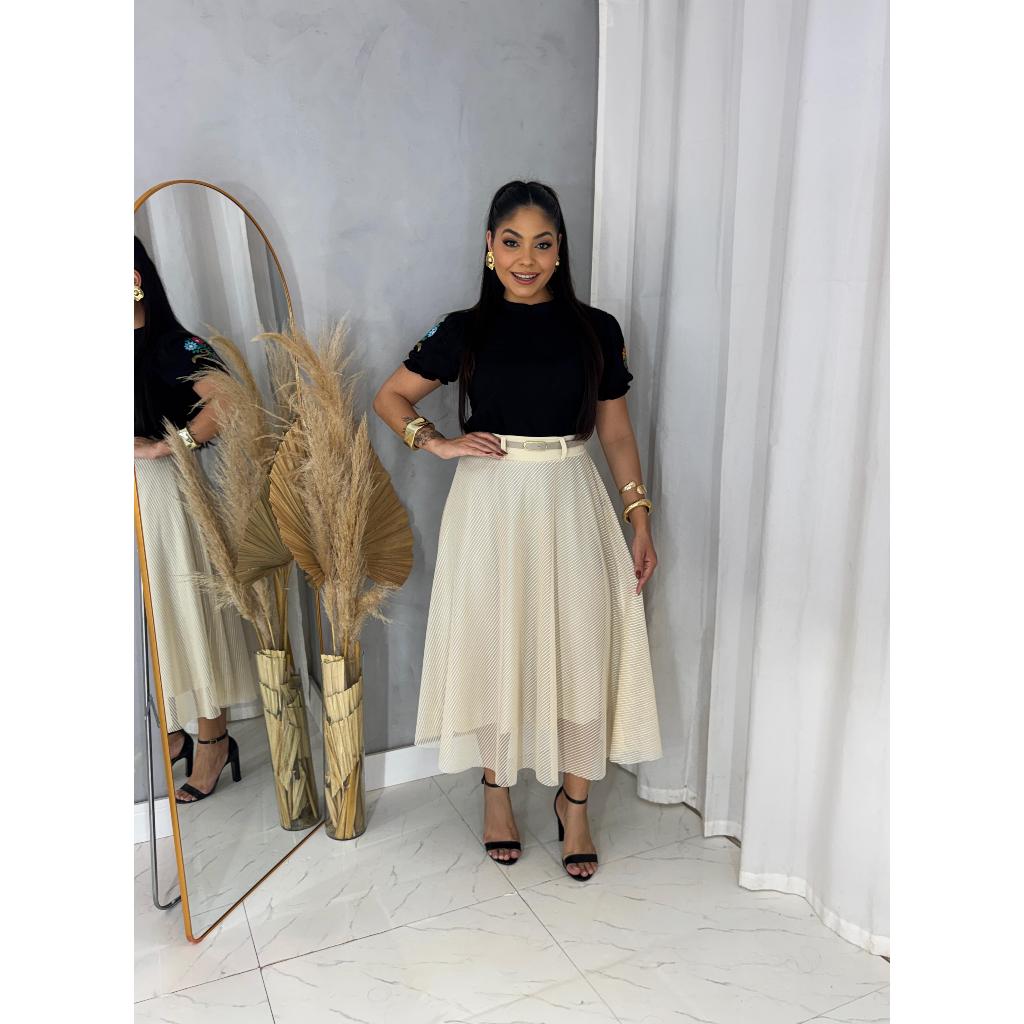 Saia longa Longuete moda evangélica De Tule Trabalhado Forrado Com Cinto Feminina