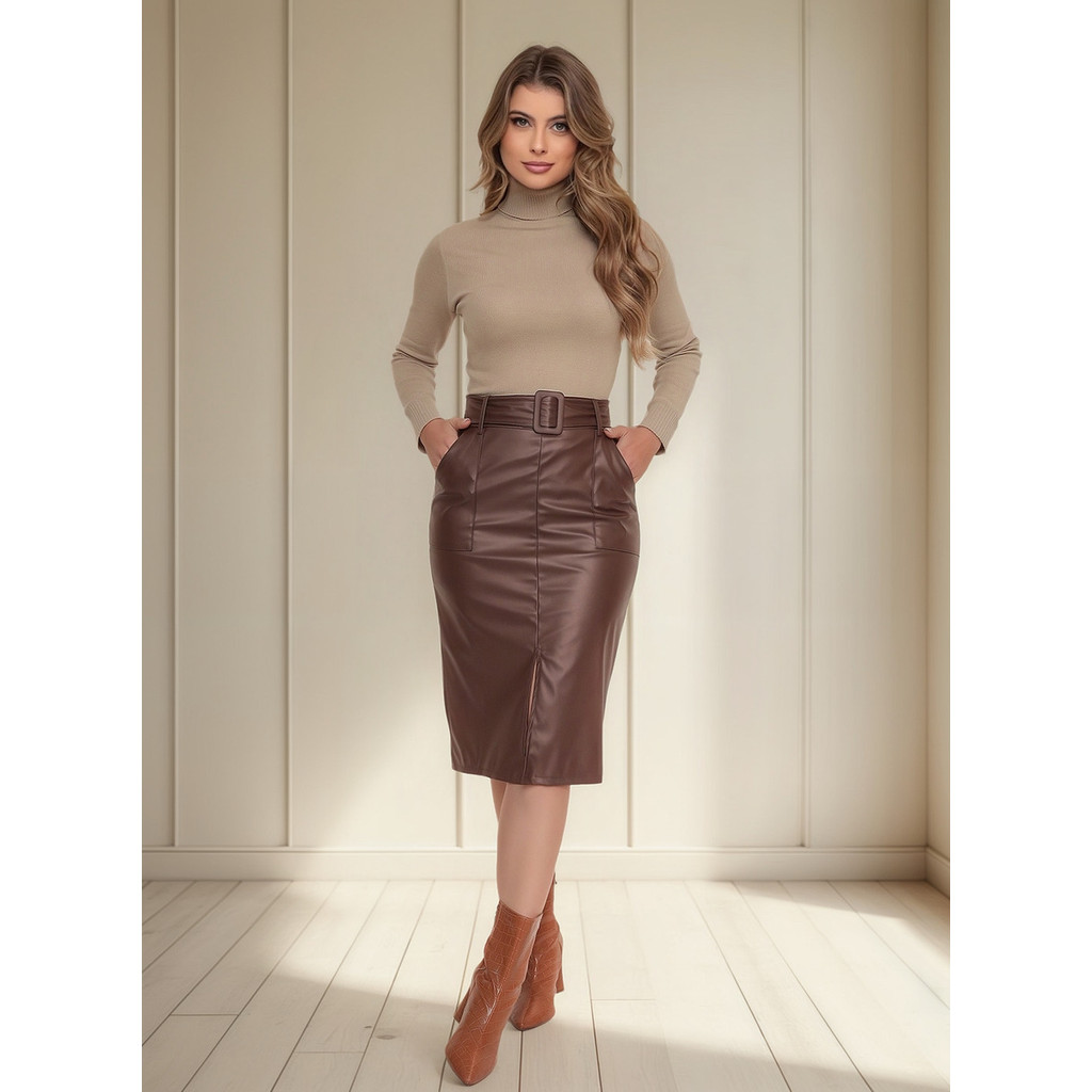 Saia Midi Couro Fenda Evangélica Premium Com Cinto E Bolsos