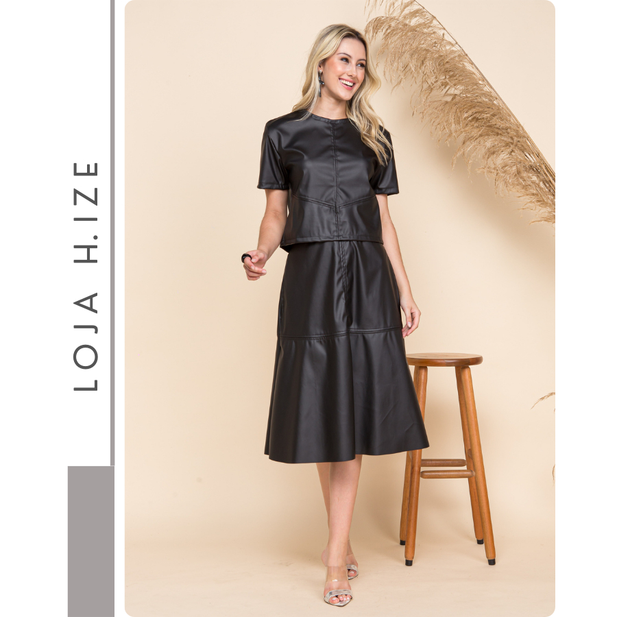 Saia Midi de Couro confeccionada em poliéster fosco sem forro. Possuí bolsos laterais e detalhe recorte na frente e atrás. Saia de cintura alta, parte inferior em evasê. A saia couro proposta para ser usado o ano inteiro, é apresentado de forma singular e leve. Combine com nosso blusa de couro sport pelo conjunto para uma composição sofisticada. São itens essenciais e versáteis que podem ser coordenados entre si e combinam com todo o seu guarda-roupa. ** Acessórios não acompanham o produto *** As cores podem sofrer alterações de tonalidade devido ao lote de fabricação e/ou de acordo com a configuração do seu monitor *** Peças compradas separas podem não formar conjunto pois podem sofrer alterações de tonalidade devido ao lote de fabricação.