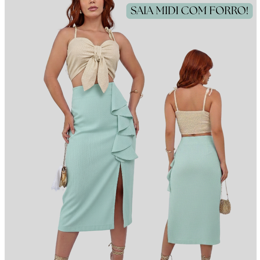 Saia Midi de Linho com Babado e Fenda Lateral com Forro | Cintura Alta | M G GG | Pronta Entrega