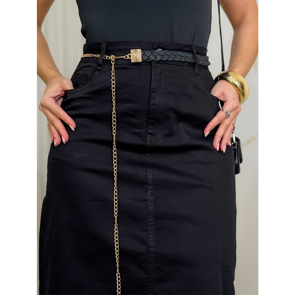 Saia Midi Feminina Brim Sarja Elastano Bolso Com Cinto 3RD SD1186