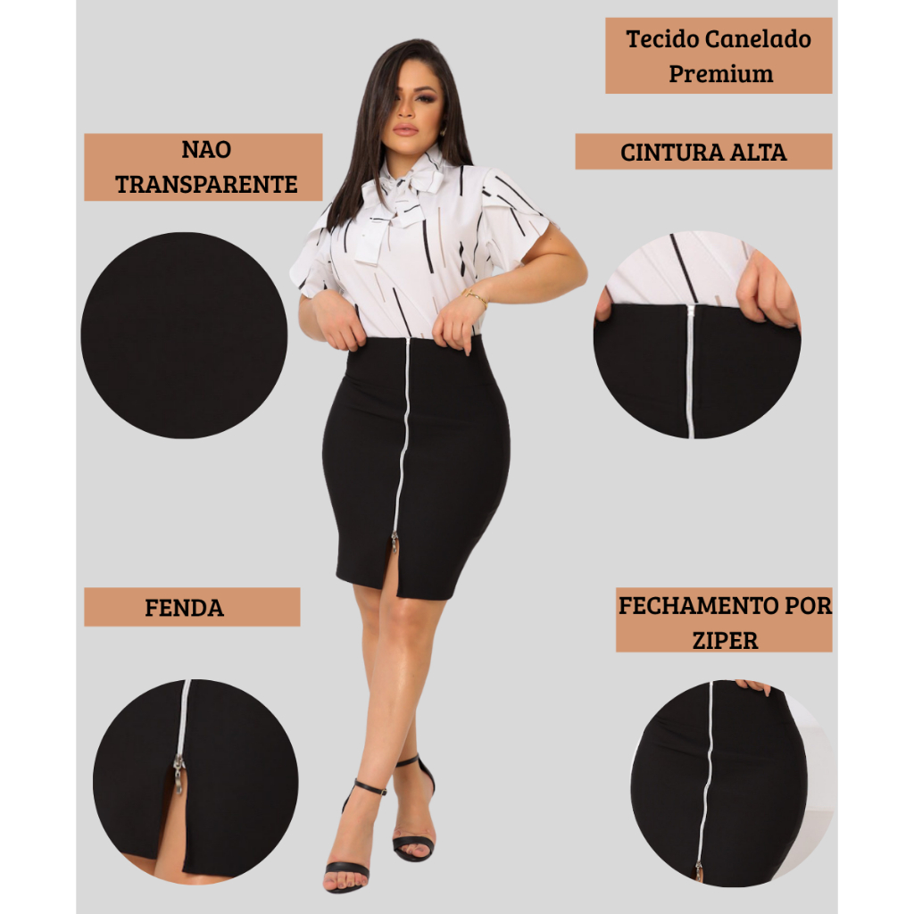 Saia Midi Feminina Canelada Preta Fenda e Cintura Alta Zíper Botoes DecorativosEvangélica Elegante