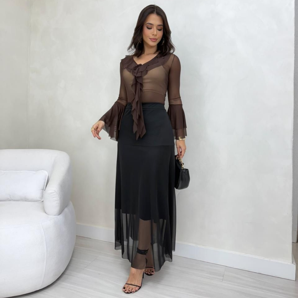 Saia Midi Feminina Longa de Tule Transparente Liso Forrado Moda Elegante