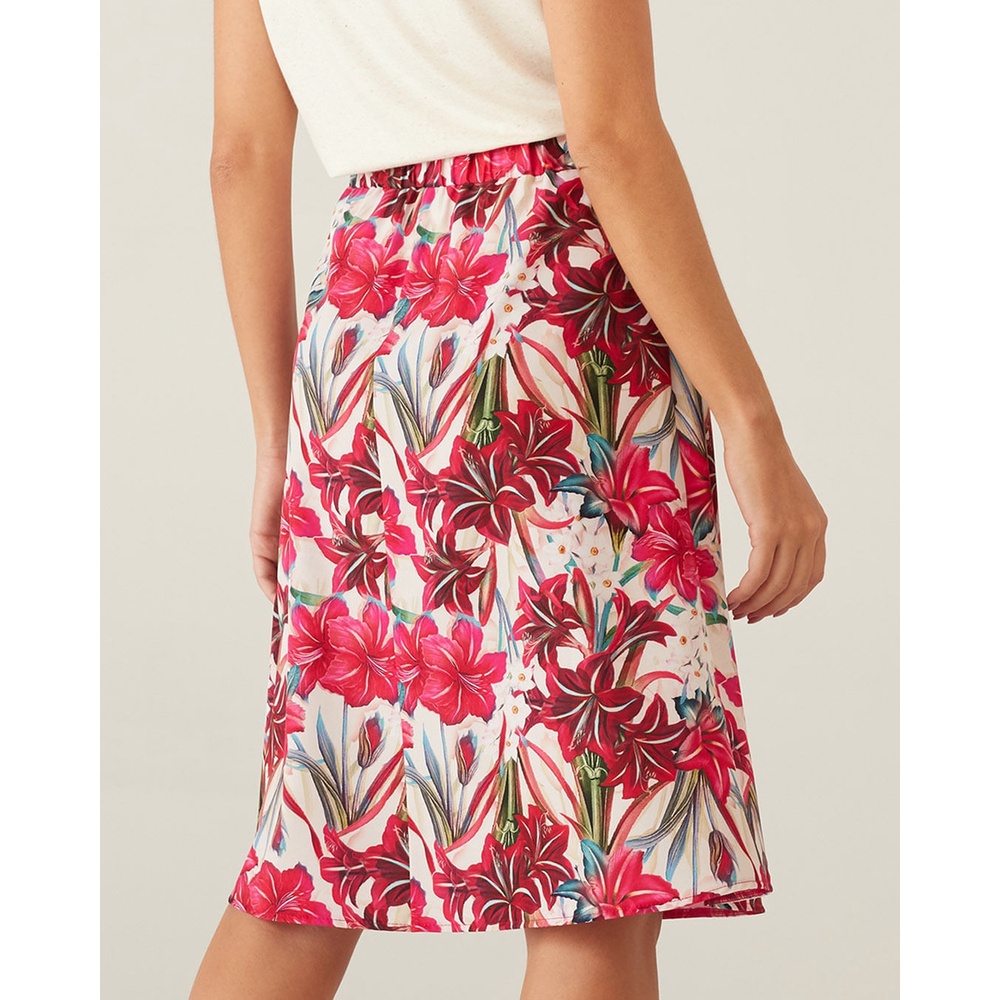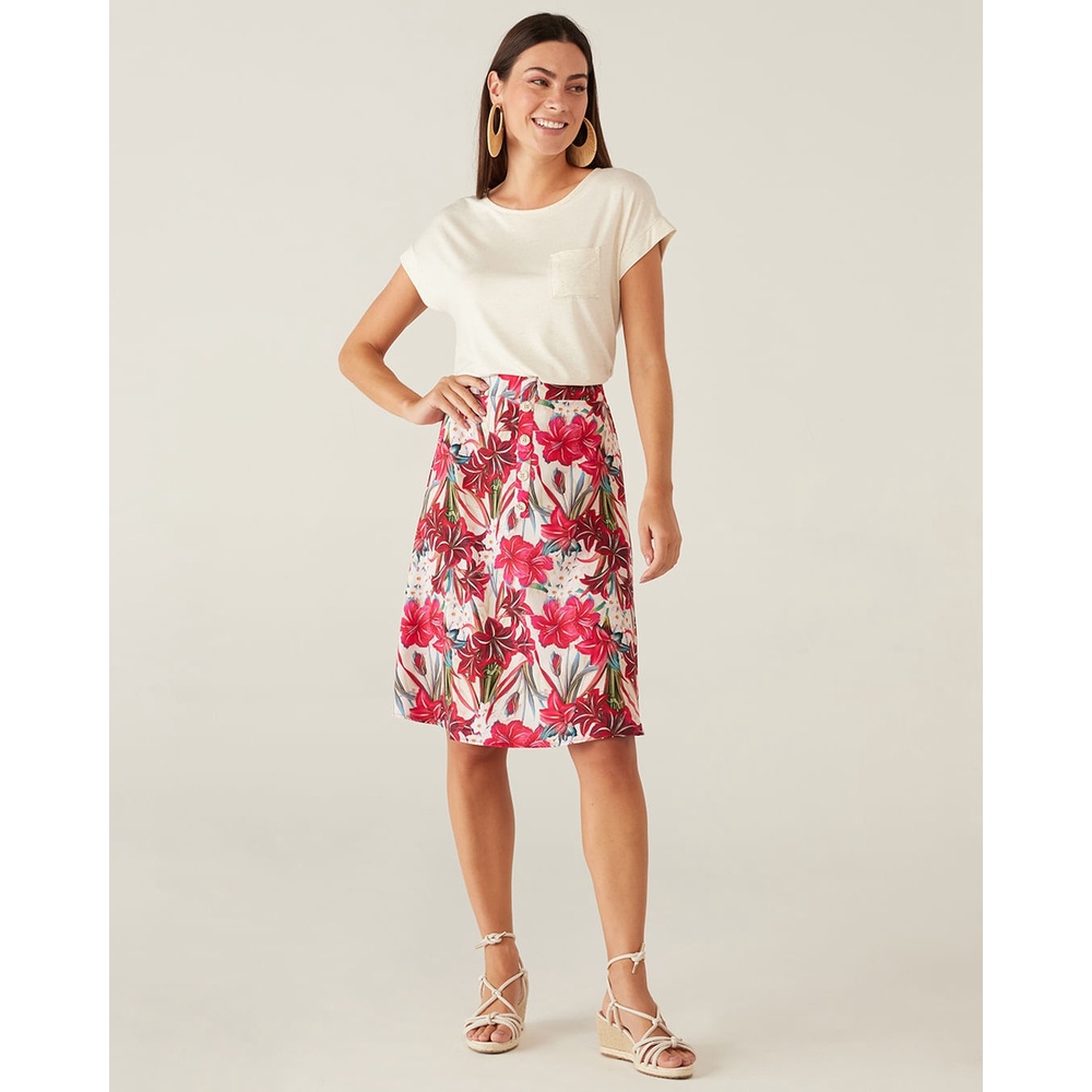 Saia confeccionada em crepe. Modelagem midi, com comprimento nos joelhos. Cintura média, cós aplicado e fechamento frontal por botões. Estampa corrida de floral. Uma peça ideal para montar visuais românticos e cheios de charme no seu dia a dia. Invista com blusa de tons neutros e sandália de tiras. Modelagem: Midi Cintura: Média Fechamento Frontal: Botões