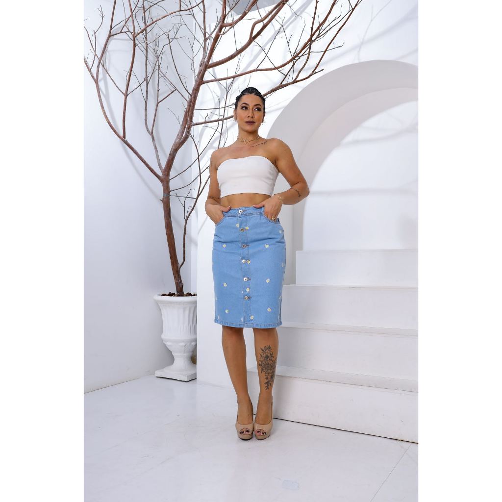 Saia MIDI jeans com estampa bordada