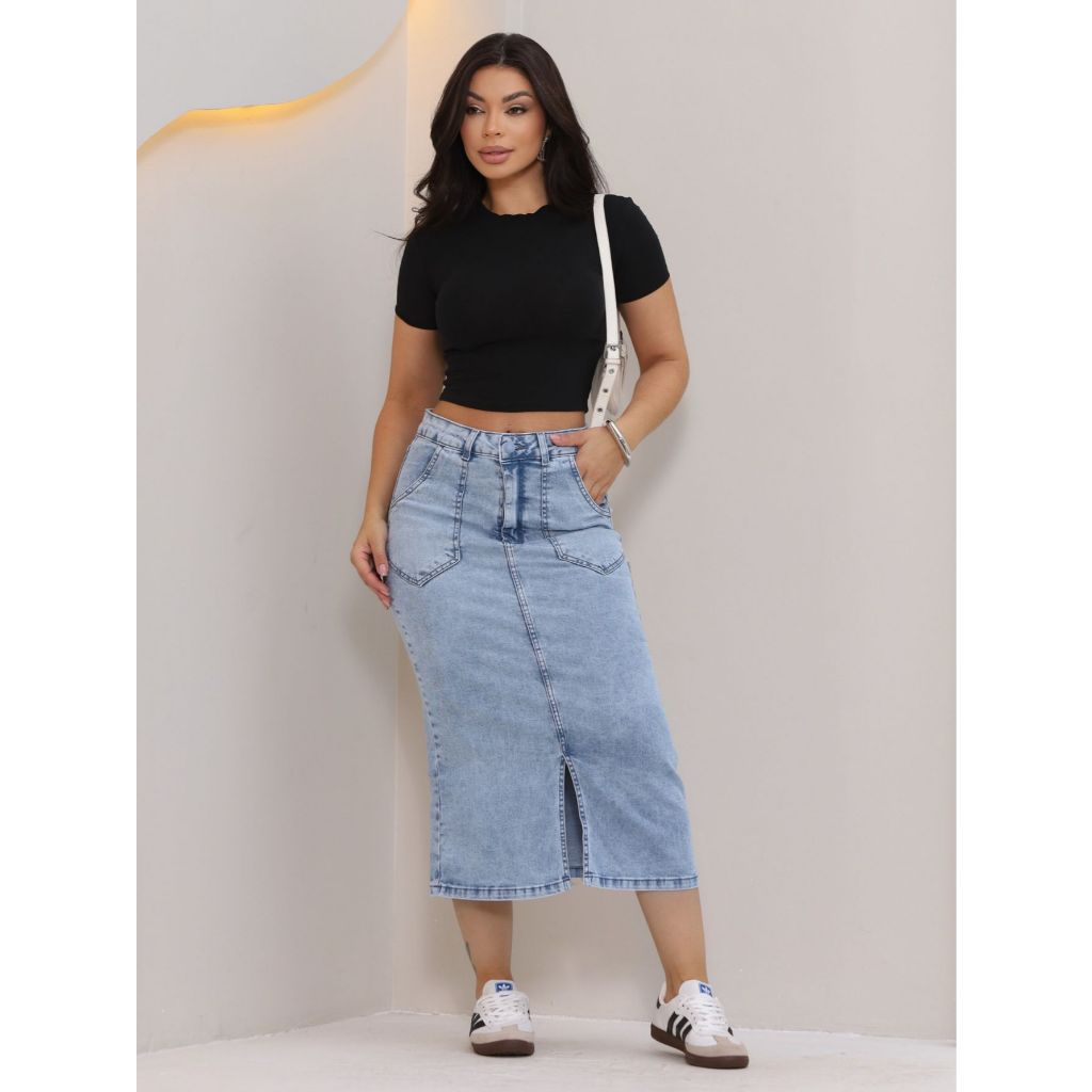 Saia midi jeans com abertura na frente Com 2% de lycra 4 bolsos funcionais Fenda: 20cm Comprimento: de 77a 80cm A modelo usa tamanho: 40 Qualquer dúvida, chamar no chat Forma normal, peça seu tamanho habitual TABELA DE MEDIDAS: 40 Cintura:73-76 Quadril:100-105 42 Cintura:76-80 Quadril:105-108 44 Cintura:80-84 Quadril:108-111 46 Cintura:85-89 Quadril:112-116