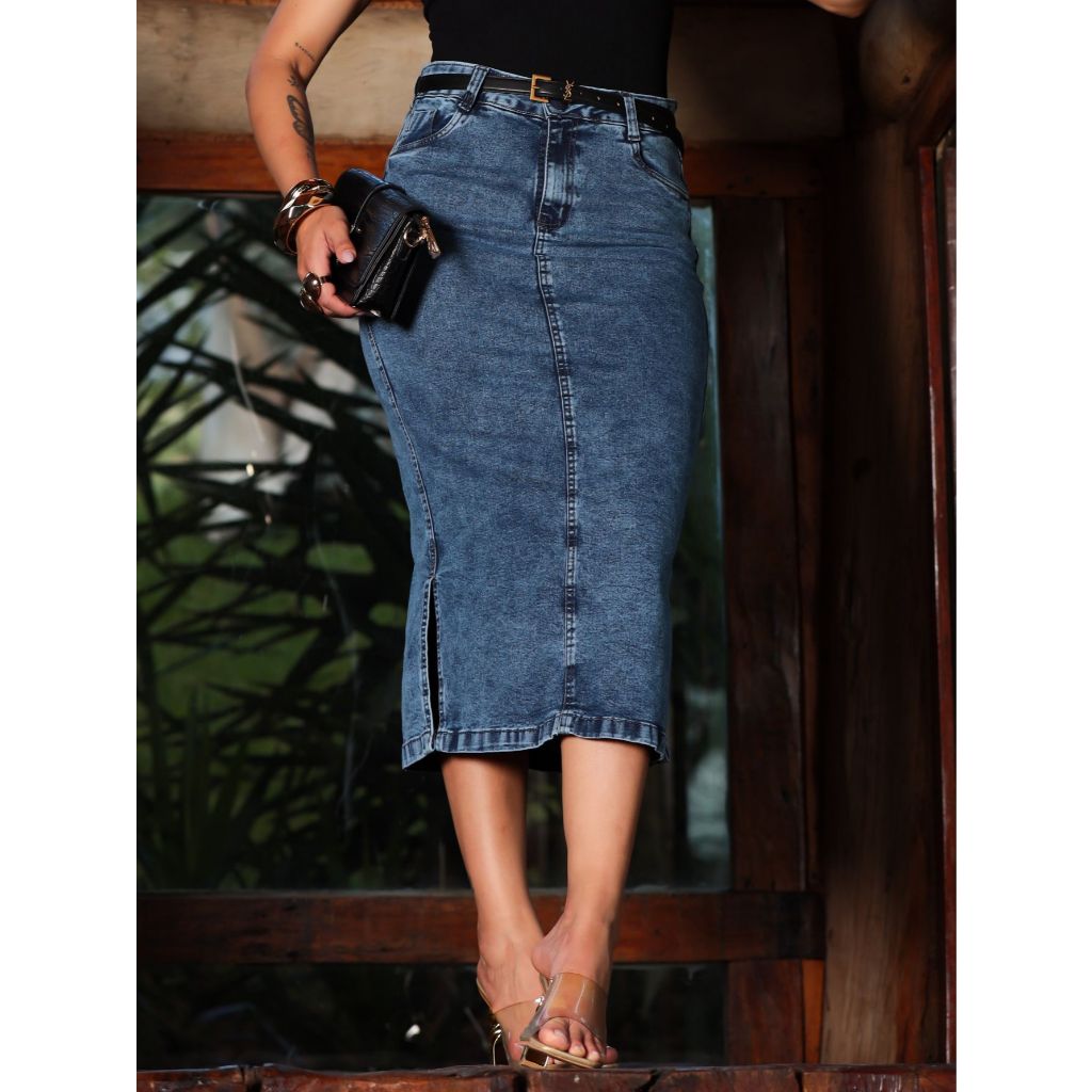 Saia Midi Jeans Com Fendas Laterais Com Lycra Modesta Culto