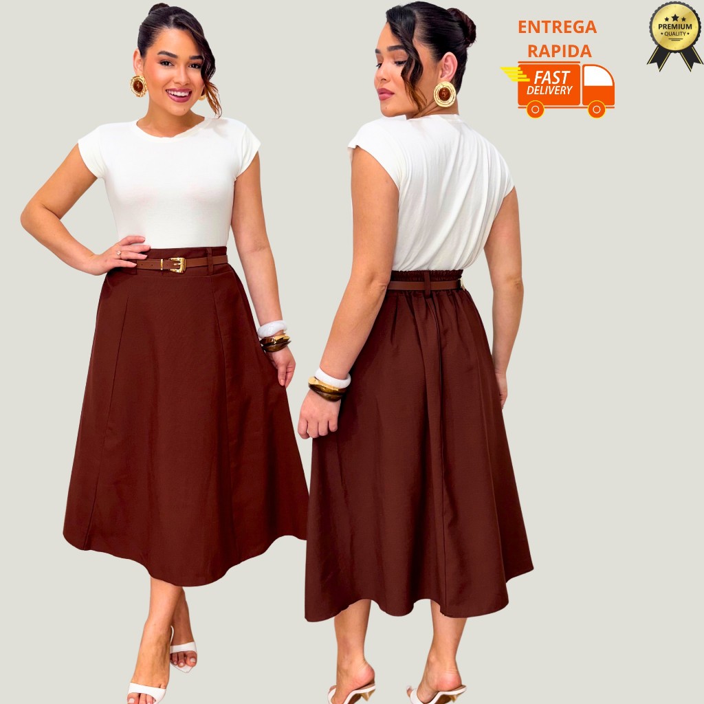 Saia Midi Soltinha Alfaiataria Cintura Alta Moda Evangélica –Tamanhos M G GG G1 G2 G3