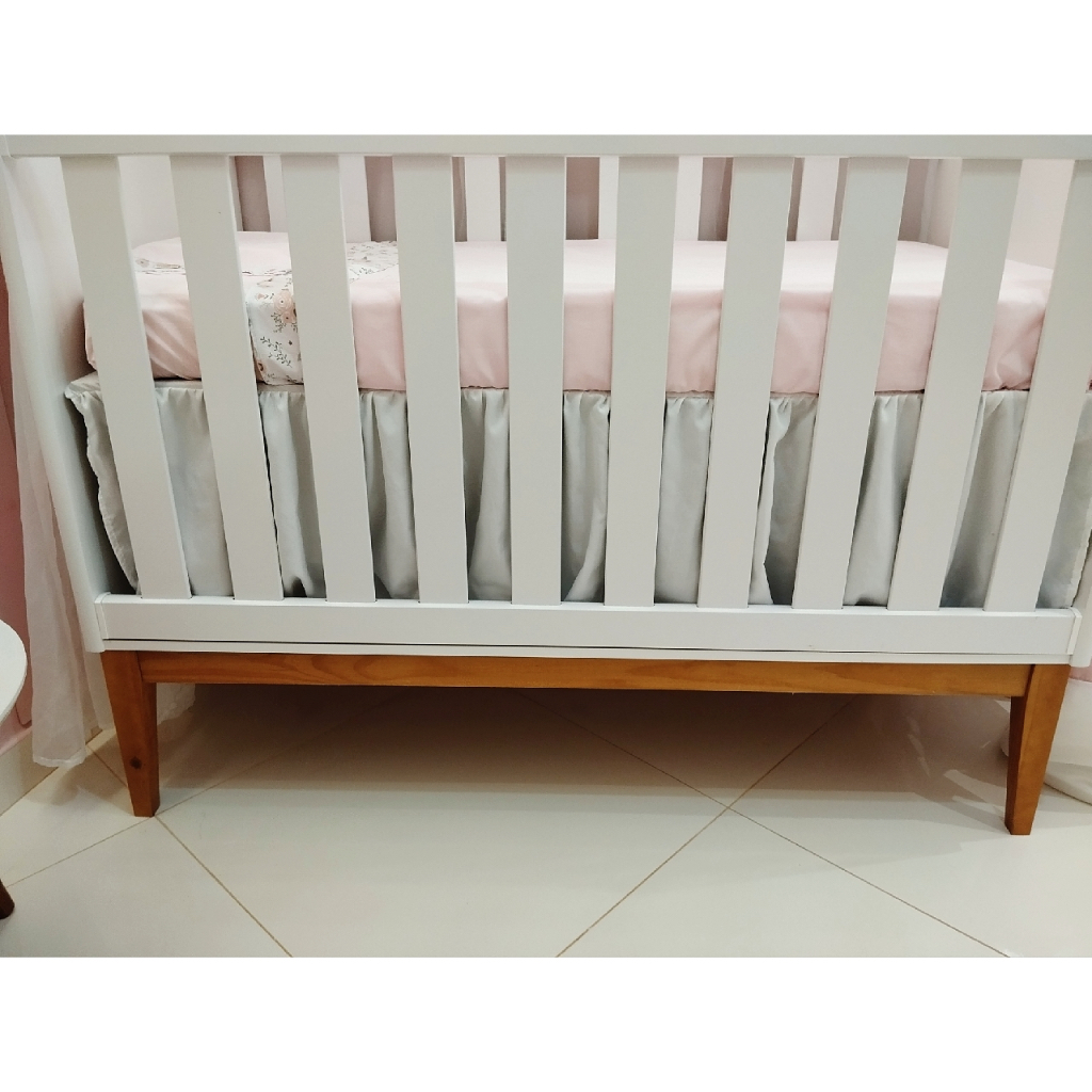 Contém na Embalagem: 01 Saia para Berço Americano (2 lados); *Ela cai para as duas laterais. Medida 70cm larg x 1,30m comp x 40cm altura; Composição: Tecido: 100% algodão. Cor: Branco