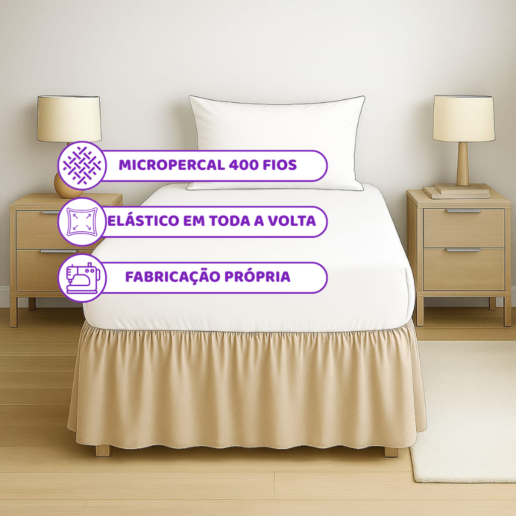 A saia para cama box com elástico feita em micropercal 400 fios é uma peça essencial para quem busca elegância e praticidade na decoração do quarto. Material: - *Micropercal 400 fios*: Este tecido é conhecido pela sua suavidade e resistência. Com 400 fios, oferece um toque macio e confortável, além de ser mais durável e menos propenso a desbotar com o tempo. Acabamento: A saia possui um acabamento impecável, com costuras reforçadas que garantem durabilidade e um visual elegante. Funcionalidade: - Elástico: O elástico embutido na parte superior da saia permite que ela se ajuste perfeitamente ao box da cama, evitando que se desloque ou amasse. - Fácil de Colocar: A instalação é simples, bastando apenas esticar o elástico sobre a cama. Cuidados: - Lavagem: Pode ser lavada na máquina em ciclo suave, preferencialmente com água fria para preservar as cores. - Secagem: Recomenda-se secar à sombra para evitar o desbotamento. Vantagens: - Protege o colchão contra poeira e manchas. - Proporciona um visual mais arrumado e sofisticado ao ambiente. - Contribui para o conforto térmico, já que o micropercal é um tecido leve e respirável.
