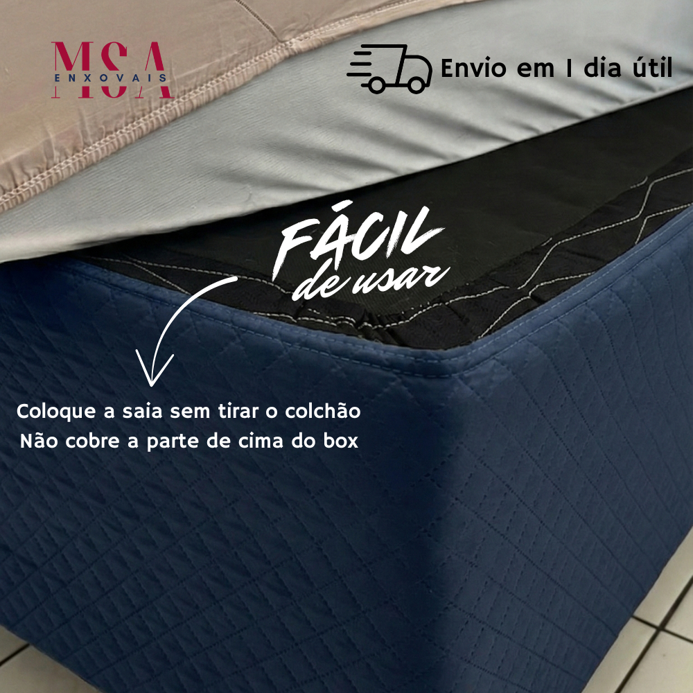 🛏️ Saia para Cama Box com Elástico – Elegância e Praticidade em um Só Produto! Fabricada em microfibra 100% poliéster, ela é resistente, leve e possui toque macio – perfeita para manter o ambiente sempre limpo, elegante e organizado. Com elástico na parte traseira, proporciona encaixe firme e se ajusta com facilidade à cama. A textura matelada valoriza a decoração e traz charme ao seu quarto. ❓ Perguntas Frequentes (FAQ): 1. A saia cobre todos os lados da cama box? Sim! Ela cobre todas as laterais e a parte frontal. A parte traseira conta com elástico para um ajuste mais seguro. 2. Serve para base mais alta que 35cm? Não recomendamos. O ideal é para bases com até 35cm de altura para um caimento perfeito. 3. Posso lavar na máquina? Sim! Utilize o modo delicado e seque à sombra para prolongar a durabilidade. 4. O tecido desbota? Não, desde que sejam seguidas as instruções de lavagem corretamente. 5. É fácil de colocar na cama? Sim! A instalação é rápida e o elástico na parte de trás facilita o encaixe. 🌟 Benefícios do Produto: ✔️ Fácil de colocar – com elástico na parte de trás para melhor fixação ✔️ Tecido resistente e durável – 100% poliéster com toque suave ✔️ Ideal para decoração – transforma o visual do ambiente ✔️ Lavável e de secagem rápida – mais praticidade no dia a dia ✔️ Acabamento matelado ultrassônico 📏 Tamanho 🔹 Casal Padrão: 1,88m x 1,38m x 30cm 🧵 Composição e Material: Tecido: Microfibra 100% Poliéster 💡 Cuidados e Dicas de Conservação: 🧼 Pode lavar na máquina (modo delicado até 40ºC) 🚫 Não usar alvejante ou produtos abrasivos 🌥️ Secar à sombra – evita desbotamento e mantém a qualidade 🧺 Pode passar a ferro em temperatura baixa, se necessário 📦 Informações Gerais: Produto enviado em até 1 dia útil após a confirmação do pagamento Imagens meramente ilustrativas – pode haver leve variação de cor conforme o monitor Garantia contra defeito de fabricação