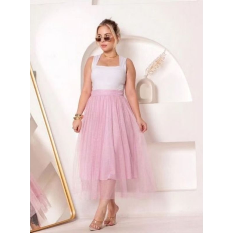 Saia tule bilho moda evangélica Encante-se com a leveza e o charme desta, feita em tule suave com delicados detalhes de glitter, A cintura com elástico proporciona conforto e ajuste perfeito, enquanto o forro garante um caimento elegante e sutil. Tamanhos: M veste 36/38 G veste 40/42 Ideal para compor looks delicados e femininos, essa saia é perfeita para momentos especiais ou para adicionar um toque de romantismo ao seu dia a dia. Envio imediato