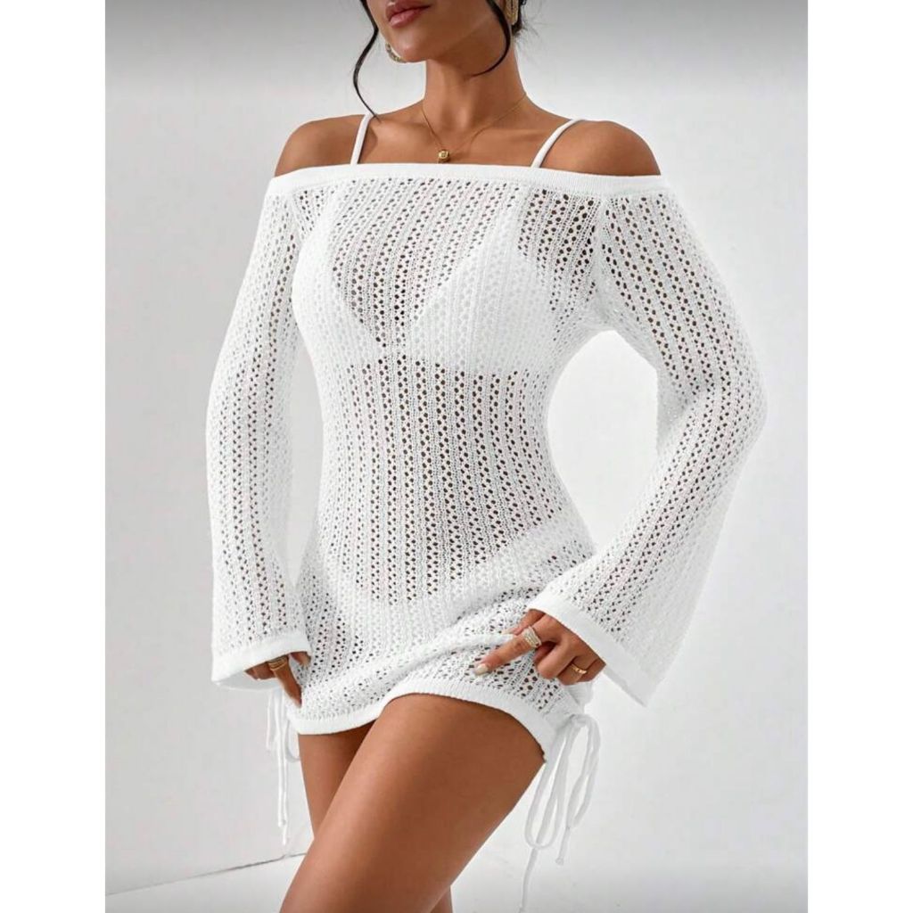 Saída curta de praia vestido ombro a ombro cordão ajustável manga boca de sino moda boho