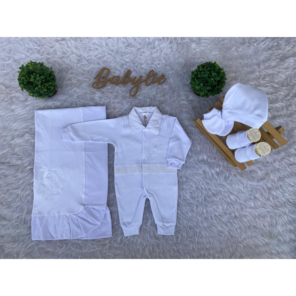 Olá seja muito bem vindo a Elisa Baby, uma empresa que está há 30 anos no mercado vestido o sonho de muitas mamães! Esse kit maravilhoso foi pensado com muito carinho para você mamãe vestir seu príncipe com muito conforto e elegância! Nosso kit é feito em tecido 100% Algodão, com ótimo acabamento e qualidade. O KIT CONTÉM: 1 - Macacão de suedine com pé simples medindo 50 cm de ombro a pé 1 - Manta de Suedine com Babado, medindo 80 cm x 80 cm 1 - Touca 1 - Par de Luvas de suedine 1 - Par de Sapatinho de malha suedine 100 % algodão OBS.: GARANTIMOS A COR PORÉM A ESTAMPA E O BORDADO VÃO DE ACORDO COM DISPONIBILIDADE DE ESTOQUE Peças disponíveis em estoque. Recomendamos para Lavagem do produto: - Opte por usar um sabão neutro ou de coco, que seja específico para bebês. - Use o ciclo mais delicado da máquina de lavar, afim de não danificar as peças que costumam ser bem delicadas. - Não deixe as peças de molho - É ideal que seja feita uma separação para a lavagem das roupas do bebê. Procure lavar peças similares e da mesma cor juntas. Para demais dúvidas estamos a disposição pelo CHAT.