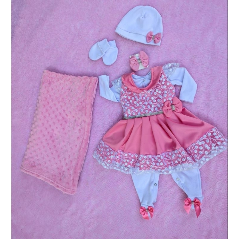 Kit Saída de maternidade bebê menina Renda completa 6 peças 1 macacão Suedine 100% algodão (macio e quentinho) 1 vestido 1 cueiro ou cobertinha 1 touca 1 par de luvas 1 faixa de cabeça combinando com o vestido. Tamanho P (veste RN a 3 meses) Macacão mede 51 cm do ombro ao pé Material e acabamento de altíssima qualidade, feito com amor. Qualquer dúvida nos contate no chat ENVIO RÁPIDO, PEÇAS A PRONTA ENTREGA Qualquer dúvida fale conosco no chat