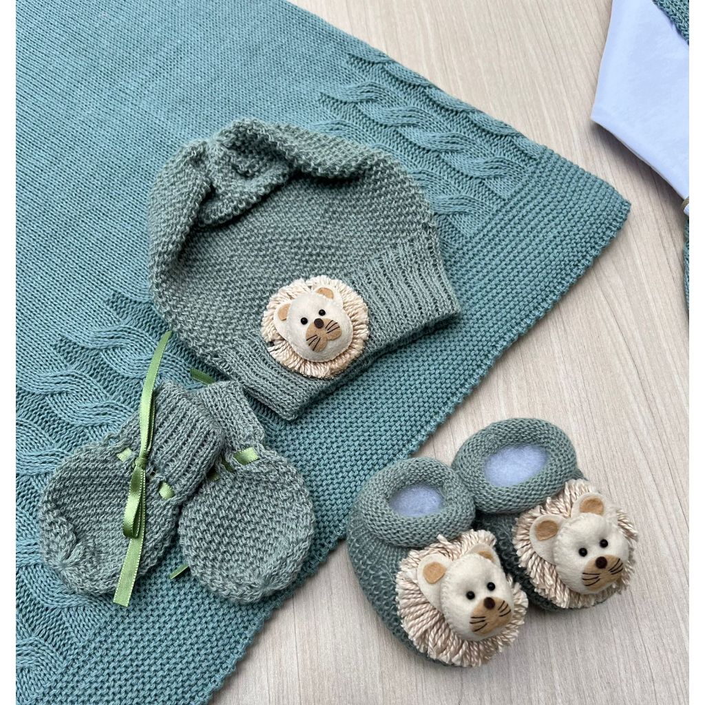 Saída de Maternidade Menino Jardineira Verde Maré Leão Tricot Kit gorro Maré