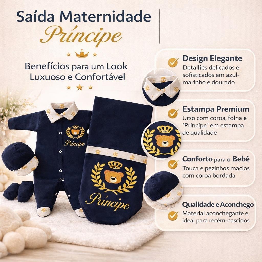 Saída de Maternidade Menino Príncipe Luxo 4 Peças Algodão Premium Look Elegante para Recém-Nascido