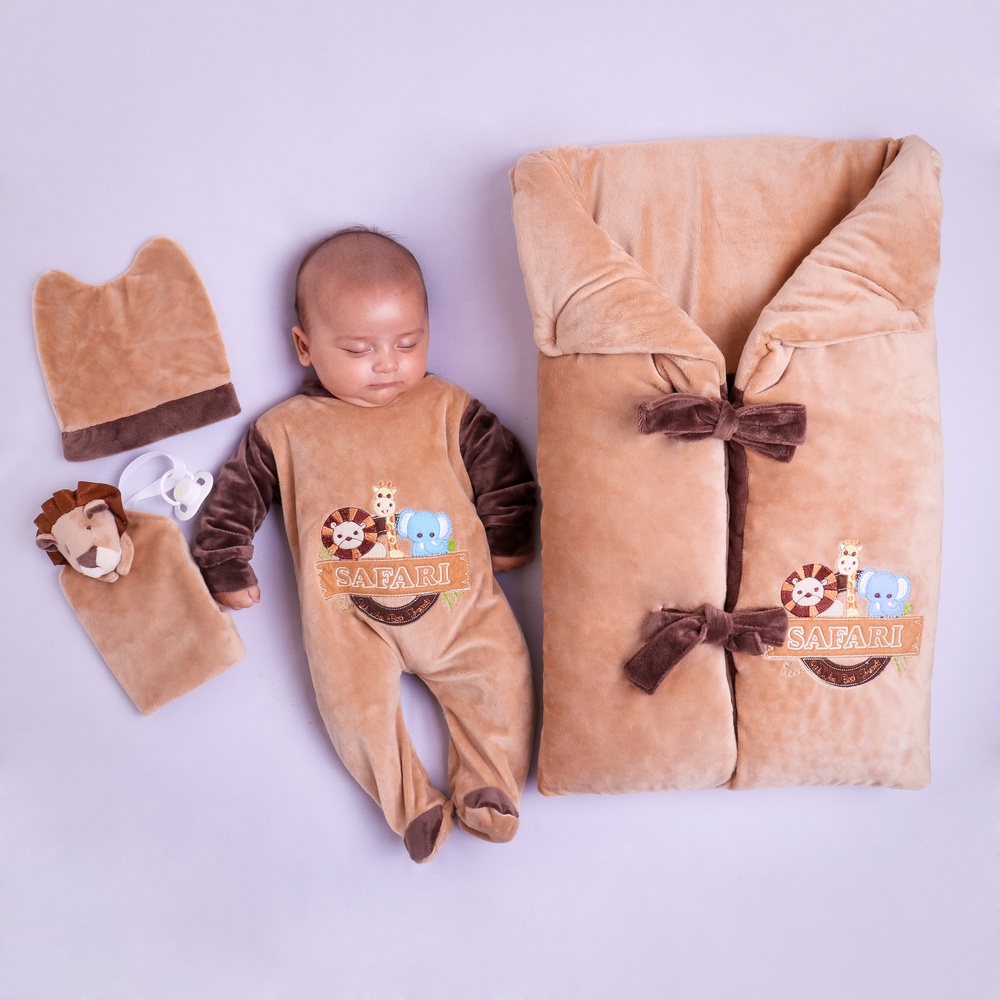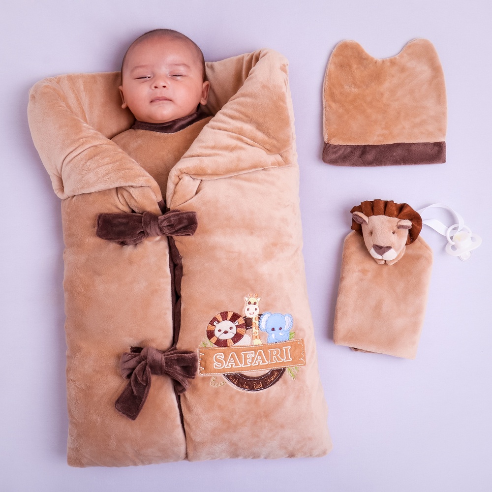 Saída de Maternidade Para bebe Menino Safari Bege com touca + naninha + porta bebe