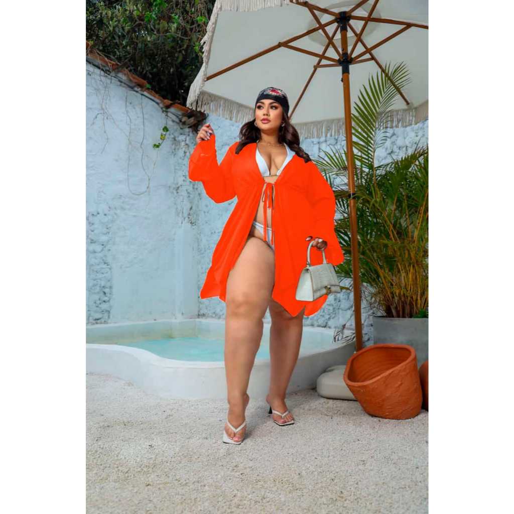 Abaixo algumas informações sobre o produto , qualquer dúvida só mandar mensagem que responderemos o mais rápido possível =D. Saída de praia curta Kimono Plus Size ideal para os seus passeios de verão , piscina , mar e etc. Tecido leve e confortável que se adequa ao seu corpo. Revisamos suas peças antes do envio Agilidade na postagem. --------------------------------------------------------------------------- Informações do produto --------------------------------------------------------------------------- - Tecido : Poliéster crepinho - Ideal para meia estação e verão - Acompanha o cinto ( do próprio tecido ) para fechar a peça no corpo - Tamanho Plus Size veste do 44 ao 50 - Foto real do produto ---------------------------------------------------------------------------- Medidas do produto sem esticar ---------------------------------------------------------------------------- COSTAS : - Comprimento: 80cm - Largura : 62cm