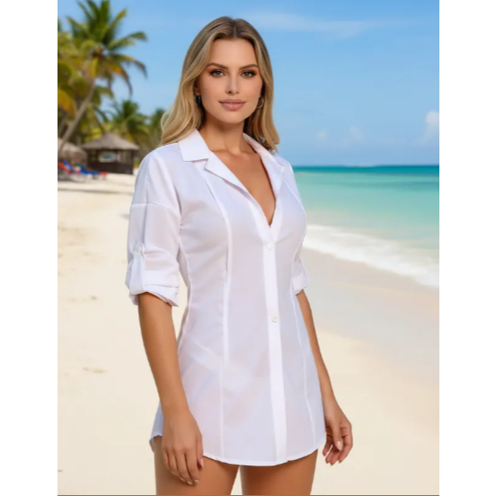 Saída de Praia Camisão Chamise Feminina Manga Ajustável Botão no Braço Leve Solta Fresquinha Verão