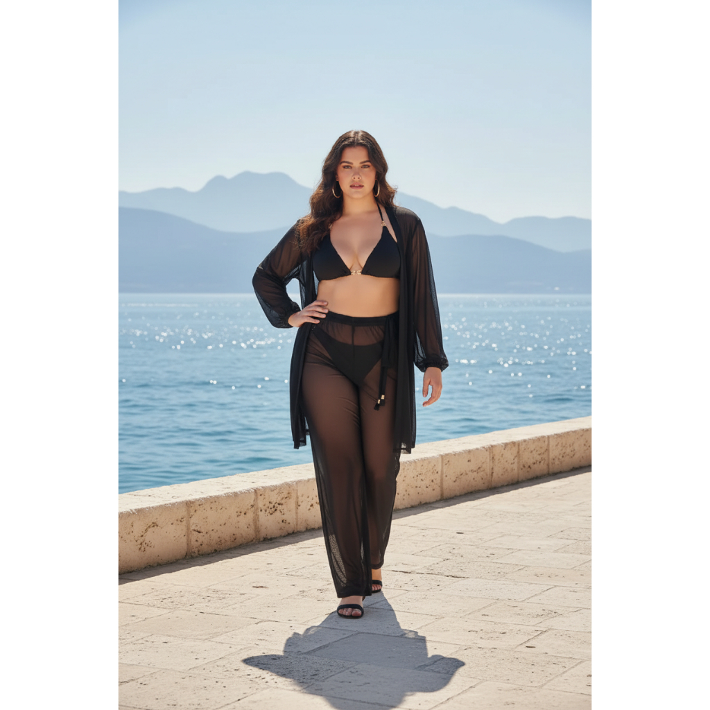 Saida De Praia Plus Size Conjunto Blusão Manga Longa e Calça Com Cordão Em Tule
