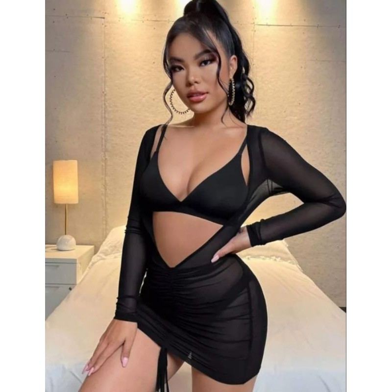 Saída de Praia Vestido em Tule Transparente Manga Longa – Tamanho Único