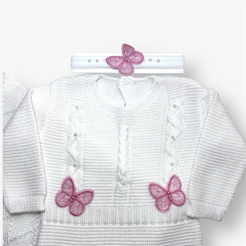 Saída Maternidade Luxo Menina Borboletas – Macacão com Virapé, Faixa e Manta Opcional - Tricô Bebê