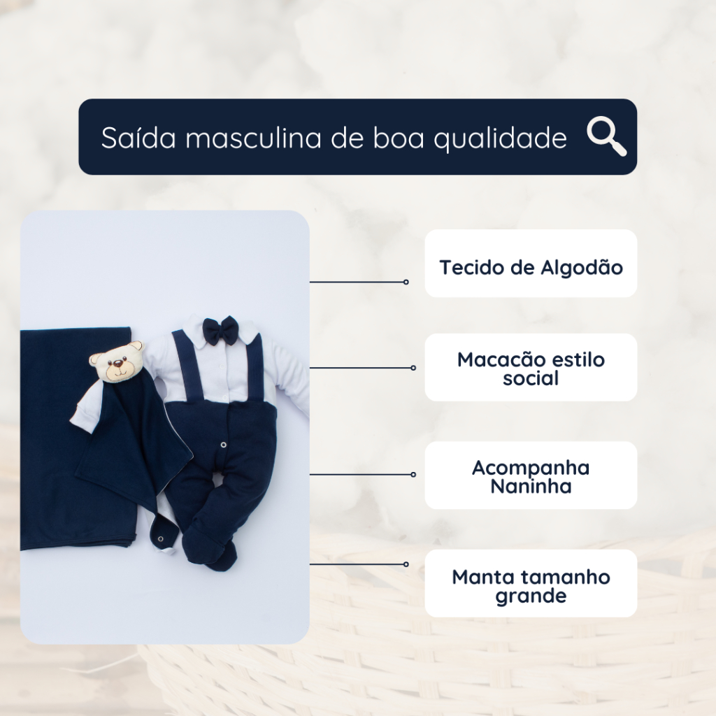 Imagine o seu pequeno príncipe dando seus primeiros passos no mundo com um visual que transborda elegância e charme. Com um conjunto de saída de maternidade especialmente desenhado para meninos, cada detalhe foi pensado para destacar a sofisticação e o cuidado com o conforto do seu bebê. O macacão com suspensório é o ponto focal deste conjunto, combinando praticidade e estilo em uma única peça. A gravata borboleta adiciona um toque de classe a peça. A manta grande não apenas mantém seu bebê aconchegado, mas também é 100% algodão macio e antialérgico, traz aconchego, ternura e proteção. A naninha com a cabeça de urso em pelúcia, além do prendedor de chupeta, são detalhes que completam o visual, proporcionando funcionalidade e estilo. Feito em malha 100% algodão macio e antialérgico, na cor azul marinho, este conjunto não só é gentil com a pele sensível do seu bebê, mas também é uma escolha que reflete o cuidado e o amor que você tem por ele. Ideal para ocasiões especiais e para aqueles momentos inesquecíveis nas primeiras semanas de vida, este conjunto social e charmoso certamente fará seu pequeno se destacar com elegância desde o primeiro dia. Itens inclusos: 01 Macacão 47cm altura X 24cm largura 01 Manta 80cm X 80cm 01 Naninha Composição: Malha 100% Algodão Por ser um produto confeccionado de forma artesanal, as medidas podem variar até 2 cm para mais ou para menos ( variação pequena , que não atrapalha a usabilidade e não interfere no tamanho final da peça) Dica de lavagem: - Lavar à mão, não deixar de molho, usar sabão neutro ou de coco e não usar alvejante. -Não misturar com peças coloridas. - Secar a Sombra ARCO-ÍRIS