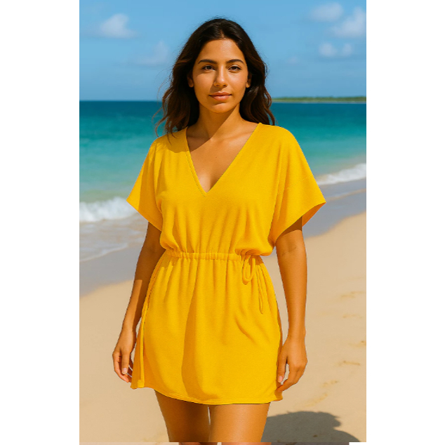 Saída e vestido de praia e piscina. Serve todos os tamanhos, se ajusta perfeitamente do P ao GG Medidas : 85 cm de comprimento ( acima do joelho) e com 120 de largura aberta, a regulagem vai até 54 de cintura fechada, passando por todas as medidas de quadril e cintura até chegar em 120 cm . Confeccionada em Helanca ou crepe duna, tecido leve e que estica, modelando o corpo.