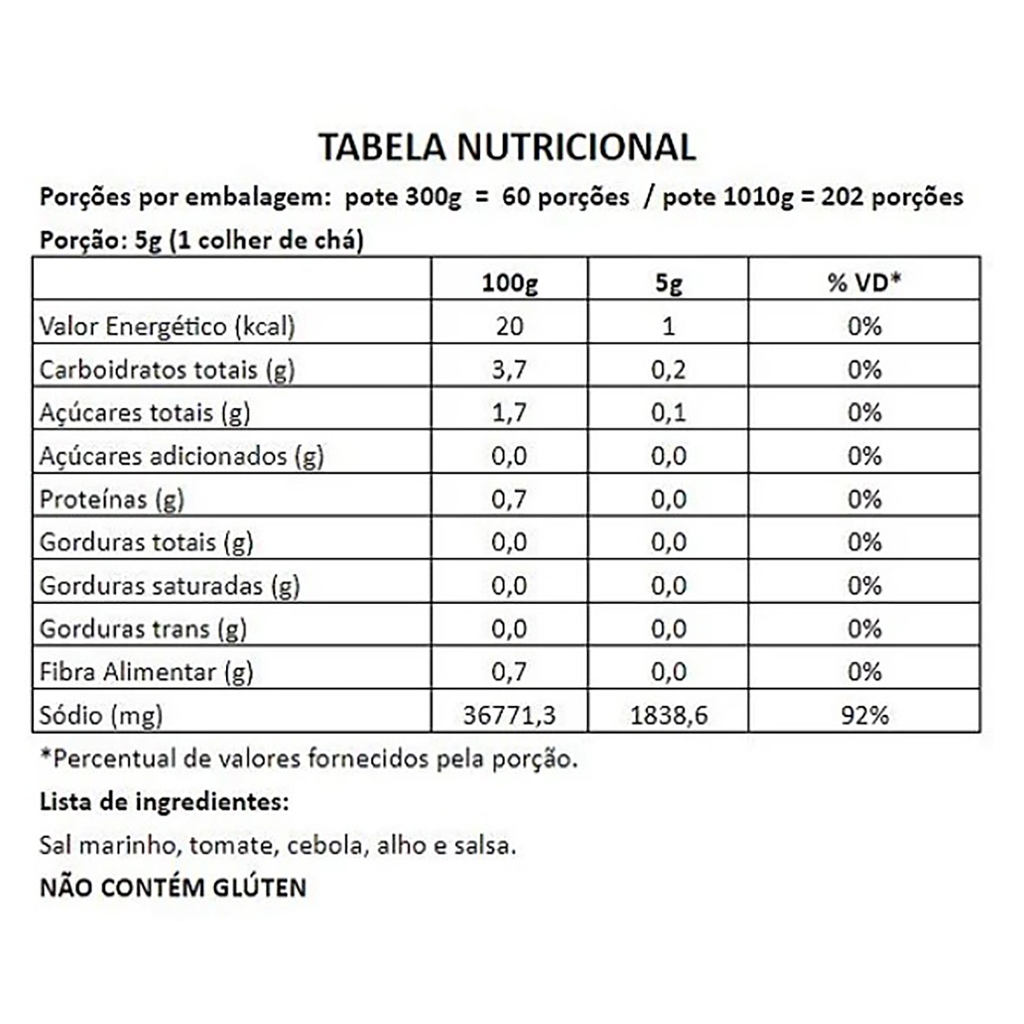 Um sal gabaritado, da melhor especificação, encontra um ícone da mesa brasileira: salga por igual enquanto entrega uma mistura cheia de bossa pra ninguém botar defeito. Use no churrasco e assados ao forno. Variar bem e surpreender sempre! Ingredientes: Sal Marinho iodado, Tomate, Cebola, Alho, Salsa Combina com : carnes, frango, suínos