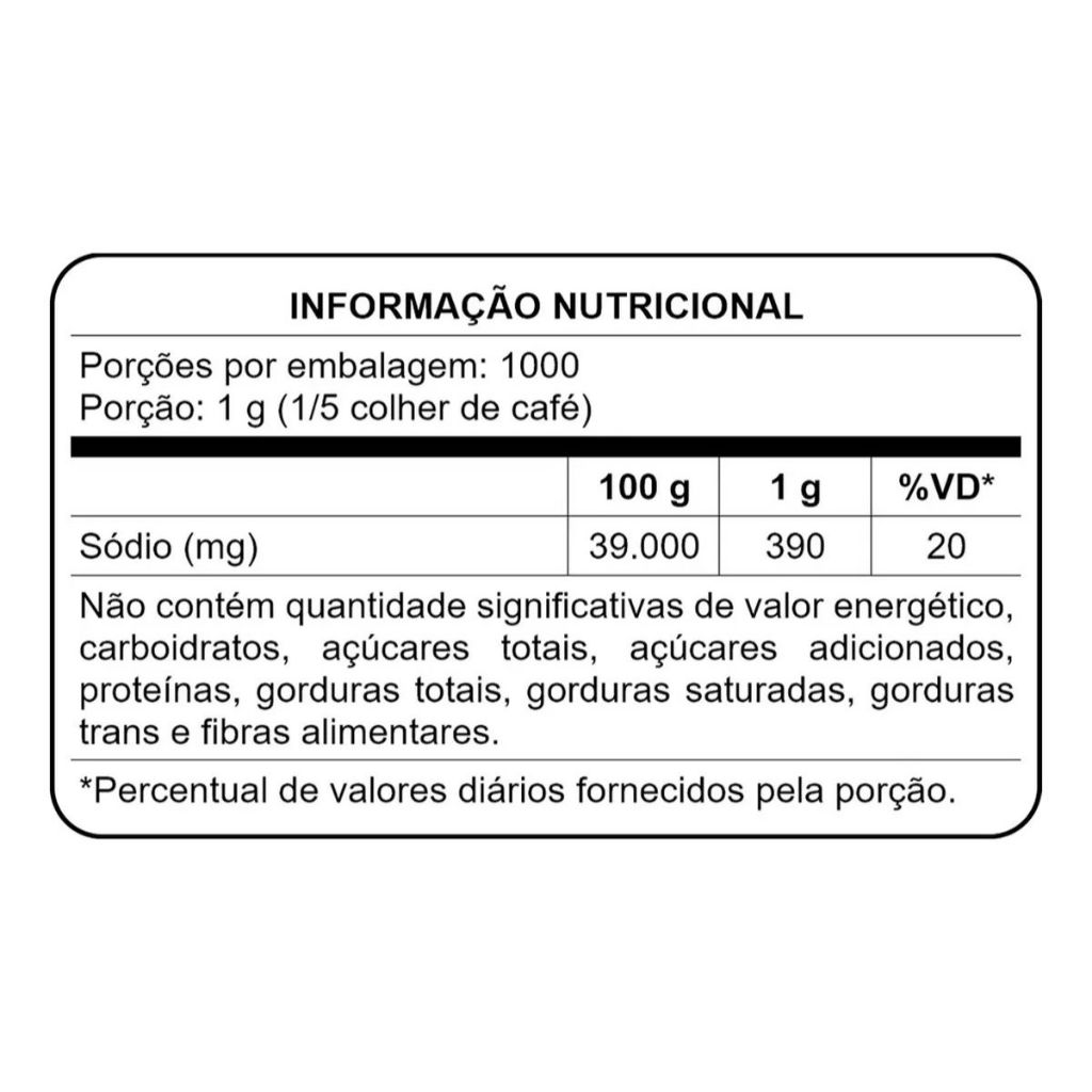 O sal marinho é recolhido nas salinas de Mossoró - Rio Grande do Norte, Brasil. Este produto é enriquecido com 15mg a 45mg de iodo por quilograma. Ingredientes: Sal e iodato de potássio e antiumectante ferrocianeto de sódio. Não contém glúten. ALÉRGICOS: PODE CONTER SOJA. Conservar em local fresco, seco e sem cheiro.