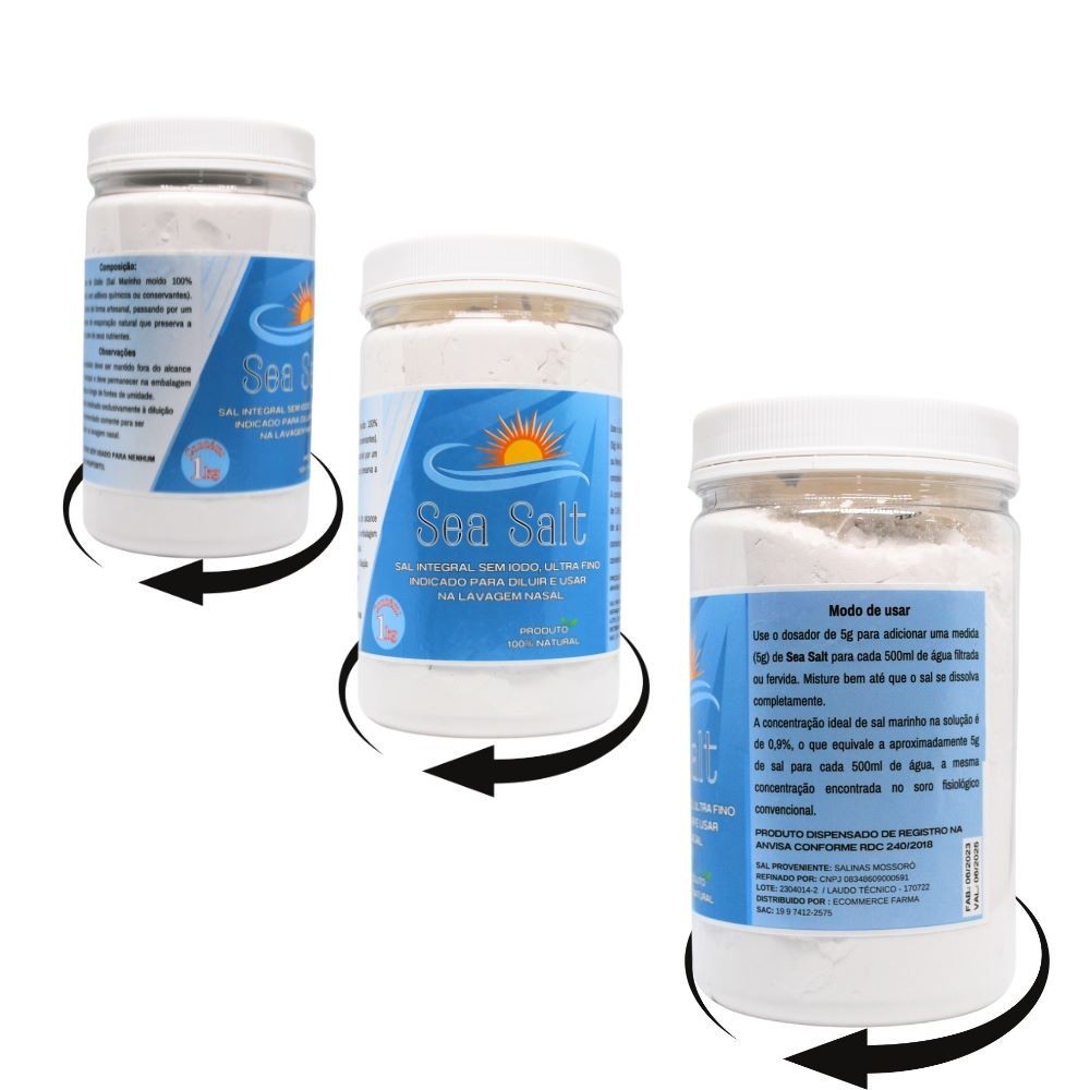 Seja Bem Vindo a Ecommerce Farma! Sal Sem Iodo Ultrafino Para Lavagem Nasal 1Kg (*ACOMPANHA COLHER DOSADORA DE 1G*) Pare de gastar dinheiro com o soro fisiológico para lavagem nasal. Faça você mesmo em casa com o nosso sal para diluição. Com apenas uma embalagem, você pode preparar até 100 litros de soro fisiológico a concentração de 0,9%. Adquira agora e economize dinheiro enquanto mantém sua saúde nasal em dia!" Modo de usar: 1) Lave bem as mãos antes de iniciar o processo para evitar contaminação do recipiente; 2) Aqueça 500 ml de água filtrada ou mineral até ficar levemente morna, antes da utilização teste a temperatura para se certificar que a água mão esteja quente; 3) Misture 1 g de sal para aproximadamente 100ml de água (Concentração 0,9%). 5 g (1dosador) rende 500ml. Preencha o higienizador nasal com essa água 4) Preferencialmente em uma Pia, incline lateralmente a cabeça e encaixe o bico do higienizador nasal na narina superior; 5) Deixe a boca entreaberta e respire por ela. Despeje suavemente a solução na narina superior para que o líquido escorra pela narina inferior; 6) Use boa parte do conteúdo de um lado. Depois assoe o nariz e inicie o procedimento com a outra narina; Dica de Conservação: Esse Produto deve ser mantido fora do alcance de crianças e permanecer fechado em ambientes que nao tenha Umidade. Boas Compras!