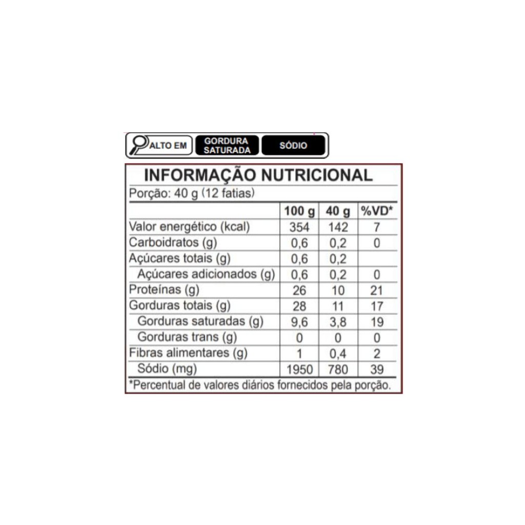 Peso de Aproximadamente 900g O salame tipo hamburguês Ceratti é o toque de sofisticação perfeito para sua tábua de frios. Feito com carnes selecionadas e especiarias naturais, sua maturação lenta e presença marcante de pimenta branca garantem um sabor rico e complexo, levemente picante. Degustado em finas fatias, proporciona uma experiência gastronômica única. Carne Suína, Toucinho Suíno, Sal, Dextrose (Agrobacterium tumefaciens, Bacillus thuringiensis, Diabrotica firgifera, Sphingobium herbicidovorans, Streptomyces viridochromogenes e Zea mays), Especiarias: PImenta-branca, Alho, Coentro e Noz-Moscada, Realçador de Sabor: Glutamato Monossódico INS 621, Antioxidantes: Eritorbato de Sódio INS 316 e Ácido Ascórbico INS 300, Cultura Starter, Conservadores: Nitrito de Sódio INS 250, Nitrato de Sódio INS 251 e Aroma Natural de Alecrim. NÃO CONTÉM GLÚTEN. NÃO CONTÉM INGREDIENTES ALERGÊNICOS. CONTÉM DERIVADO DE MILHO TRANSGÊNICO. CONTÉM SUÍNO ALIMENTADO COM RAÇÃO CONTENDO INGREDIENTE TRANSGÊNICO.