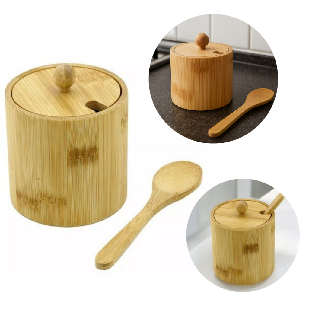 Saleiro de Madeira Açucareiro de Bambu com Tampa e Colher Pote de Bambu Cozinha 200ml