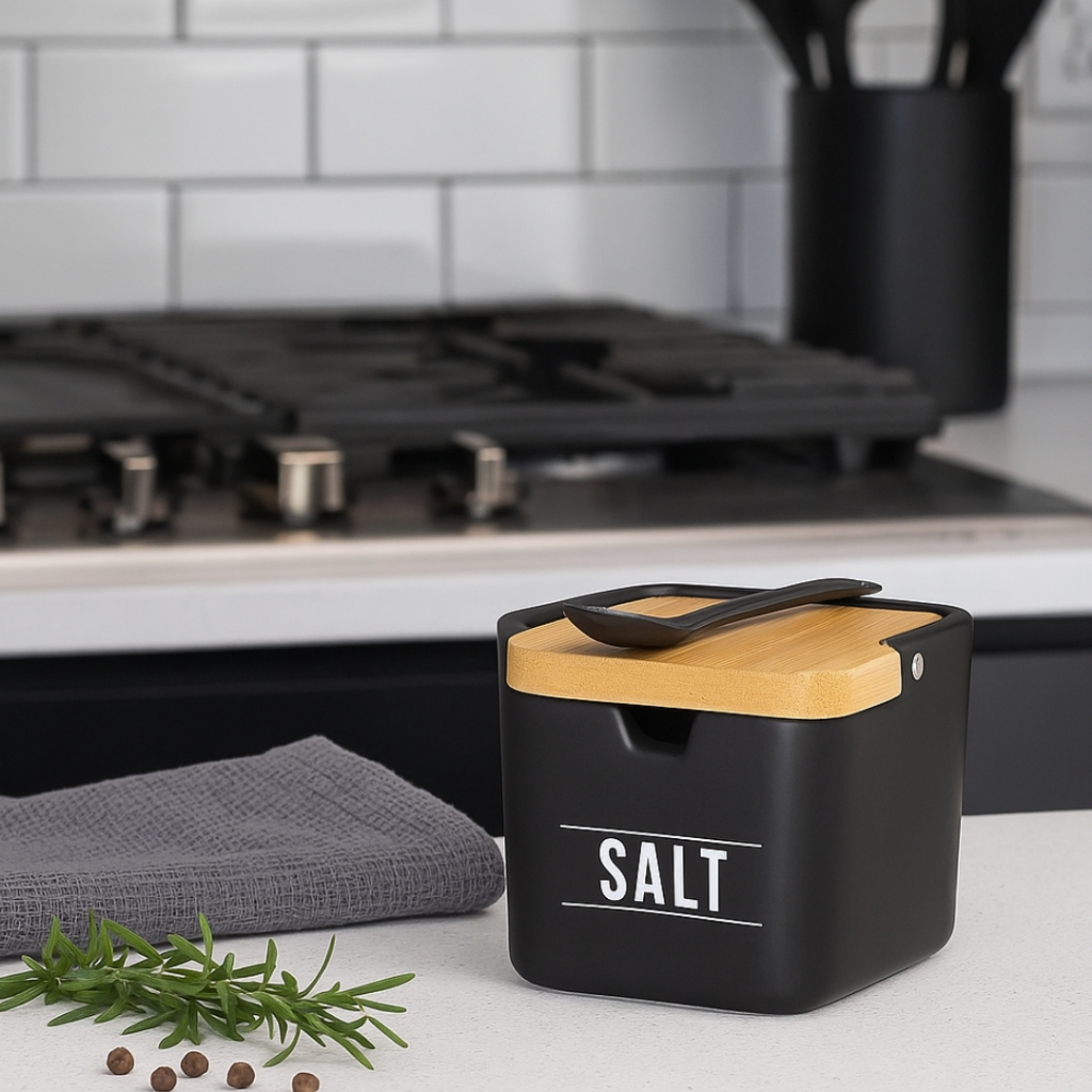 Saleiro de Porcelana com Colher + Tampa de Bambu Salt Manhattan Hauskraft 270ml