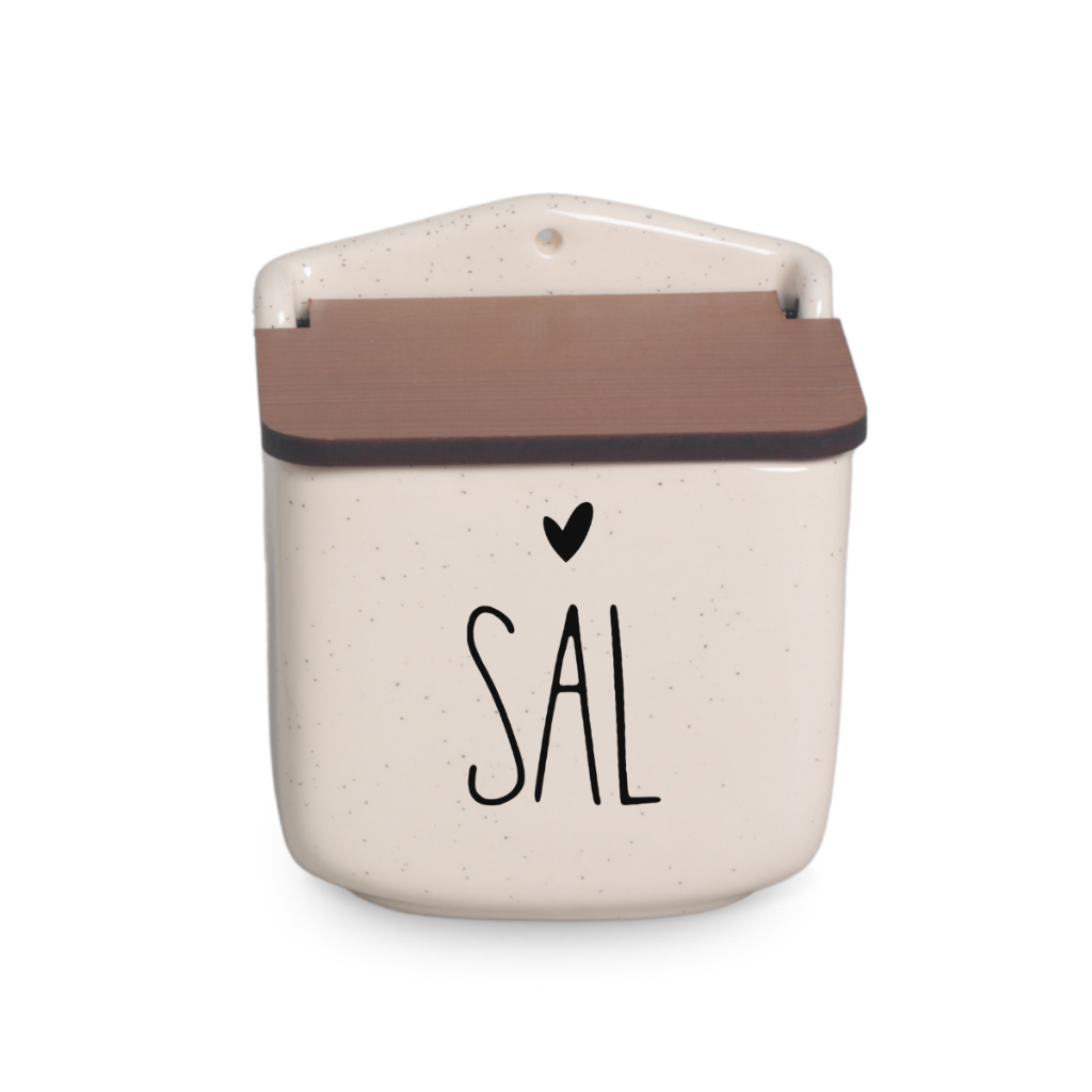 Saleiro Duo Bege de Cerâmica Tampa de MDF Segunda Linha Defeitos Cozinha Decoração SAL CORAÇÃO DUO