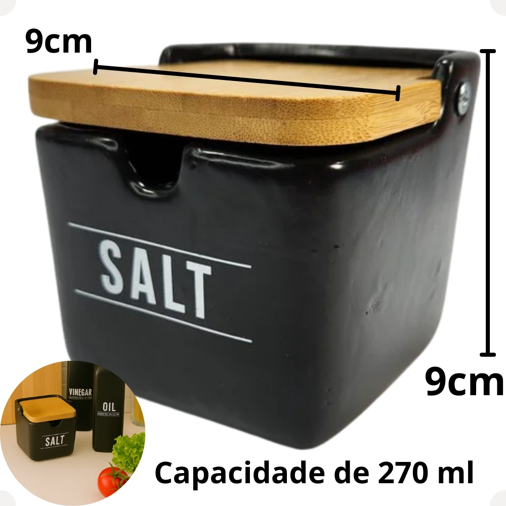 Saleiro Manhattan Preto 270ml Porta Sal Salt Porcelana Com Tampa de Bambu Coleção Haüskraft..