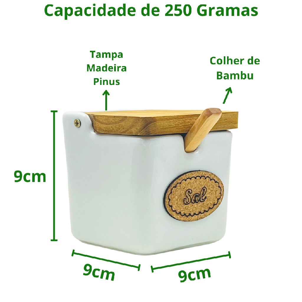 Saleiro Porcelana Branco Premium 250g com Colher Bambu Mesa Posta Cozinha Moderna Elegante