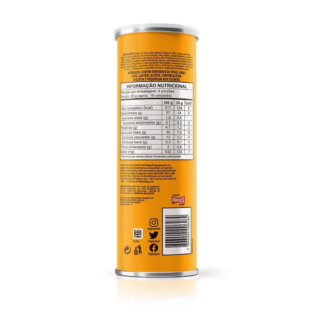 O salgadinho Batata Frita Pringles®, vem em sua icônica lata para proporcionar uma experiência incomparável. É o salgadinho que foi feito para você! Com suas batatas que encaixam perfeitamente na sua língua, e que te surpreende a cada mordida com uma crocância incomparável e um sabor único. Pringles® é autêntica, divertida e surpreendente. Suas batatas perfeitamente empilhadas, te permitem levá-las para todos os lugares. Em meio à correria do dia a dia, ele é uma pausa merecida, um momento de relaxamento que revigora e renova suas energias. Mas também ideal para dividir com a galera, e tornar todos os encontros mais especiais. O sabor Queijo tem uma crocância surpreendente com um sabor único para os apaixonados por queijo. Desfrute deste salgadinho na versão Queijo ou explore os sabores Original, Creme e Cebola, Churrasco e Cheddar e Bacon.Dê um pop na sua mente com Pringles®!